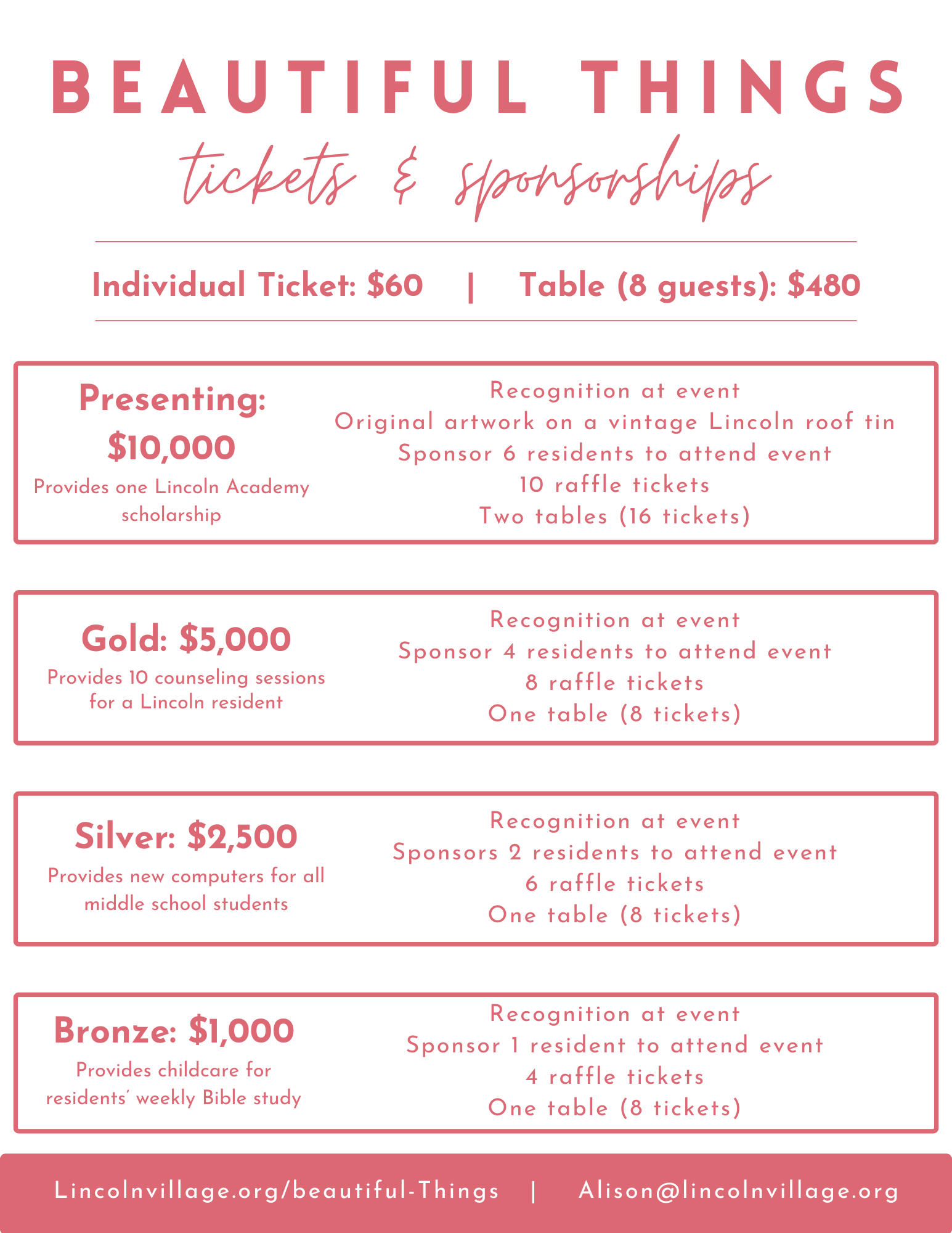 Beautiful Things Info Coming Soon! Email alison@lincolnvillage.org for instructions on how to pay for your tickets/tables/sponsorships